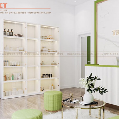 Nhằm mang những sản phẩm làm đẹp chất lượng đến gần hơn với người tiêu dùng, mẫu thiết kế spa này sử dụng tủ trưng bày bằng gỗ MDF chống ẩm phủ Melamine kết hợp cùng cửa kính. Hệ thống đèn Led trong tủ được thiết kế nhằm tạo sự thu hút và làm nổi bật các mặt hàng.