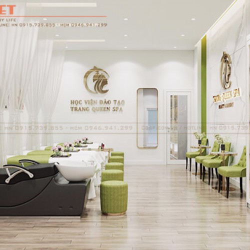 Có thể nói, việc kết hợp màu sắc mang tính xu hướng là một nét sáng tạo trong setup cửa tiệm. Mặc dù hướng đến hình ảnh trẻ trung với việc sử dụng màu xanh lá cây làm điểm nhấn tươi mới, song, Trang Queen Spa vẫn cho thấy sự tinh tế, sang trọng nhờ những chi tiết trang trí màu vàng gương hay họa tiết vân đá.