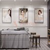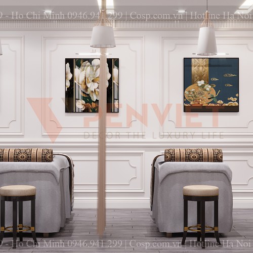 Thiết kế nội thất tầng 2 Tuấn's spaCác mảng tường trống được nẹp phào chỉ tinh tế kết hợp tranh trang trí, tạo vẻ đẹp cuốn hút và sang trọng cho không gian spa.