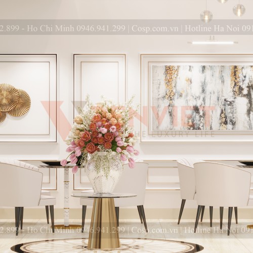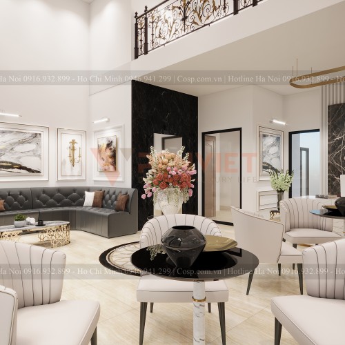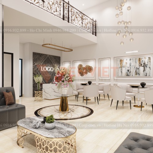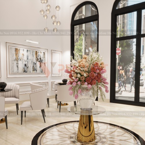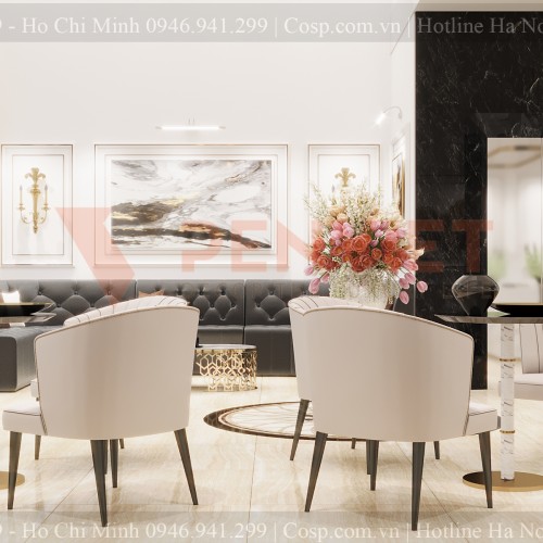 Đối diện với bộ bàn ghế sofa lớn ở phòng khách là hai bộ bàn ghế chờ để tạo nhiều không gian đón tiếp khách hàng hơn. Chiếc ghế chờ thì được bọc đệm nỉ êm ái với chân sắt mạ vàng. Còn chiếc bàn chờ thì được làm bằng mặt đá nhân tạo với chân sắt sơn tĩnh điện.