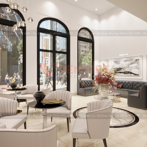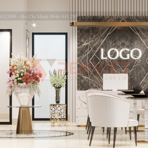 Khu vực quầy lễ tân được thiết kế với một chiếc quầy làm bằng gỗ MDF sơn O7 với đá Granit ốp bên ngoài cùng bề mặt đá trắng Yên Bái. Tấm vách logo phía sau quầy lễ tân thì làm bằng đá gỗ vân mây Nghệ An màu đen rất đẹp