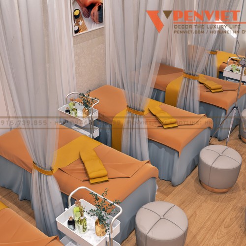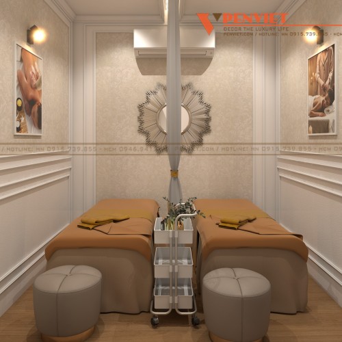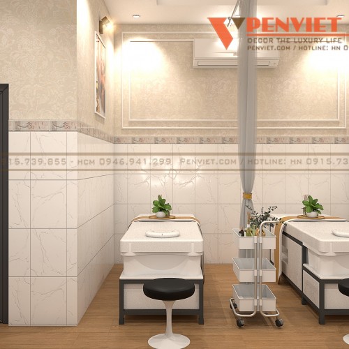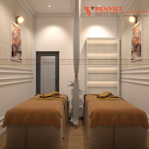 Là một người vô cùng tinh tế, chị Duyên muốn thành một không gian riêng dành cho những vị thượng khách đặc biệt của mình. Hiểu được mong muốn đó, các kiến trúc sư của Penviet đã thiết kế không gian phòng VIP với 2 giường trị liệu và tủ đồ vật dụng trong mẫu thiết kế thẩm mỹ viện này.