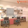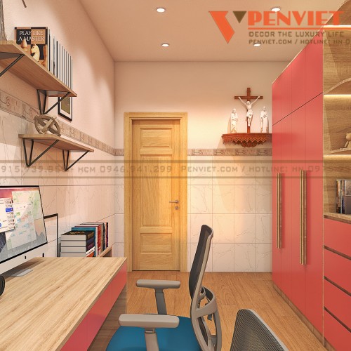 Bàn học gỗ MDF phủ melamine có ray kéo tiện lợi với ghế xoay linh hoạt. Nhằm tối ưu không gian, kệ sách được đặt áp tường chia thành các ngăn ô nhỏ, giúp phân loại và sắp xếp vật dụng khoa học.