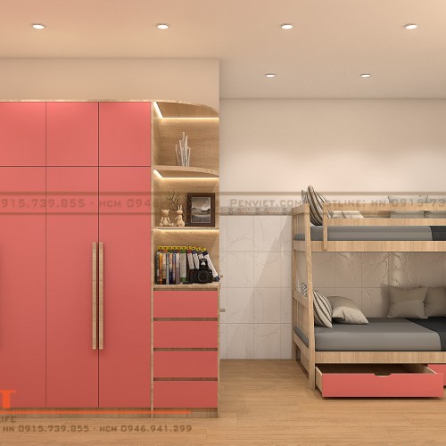 Tại phòng ngủ của bé, chúng tôi setup nội thất tương đối đầy đủ để phục vụ nhu cầu sinh hoạt và học tập của 2 bé.