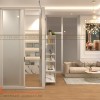 Hệ tủ quần áo gỗ MDF phủ melamine mặt kính cường lực, nẹp viền khung nhôm mang đến sự hiện đại, trang trọng. Theo đó, việc sử dụng kính cường lực cũng tạo chiều sâu, giúp không gian phòng ngủ thêm thoáng đãng, rộng rãi hơn.