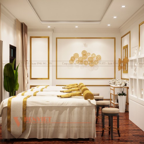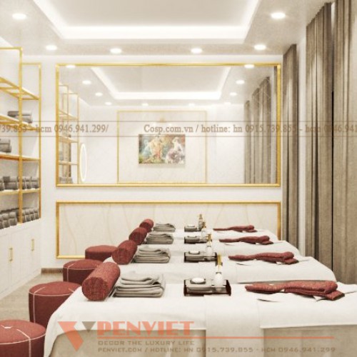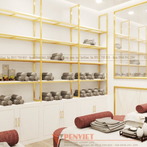 Phòng spa được Penviet thiết kế với đầy đủ đồ nội thất đảm bảo phục vụ mọi nhu cầu của khách hàng và nhân viên spa. Bên cạnh những giường massage hiện đại, chúng tôi đã thiết kế thêm tủ đựng khăn và mỹ phẩm trị liệu để kỹ thuật viên có thể thao tác nhanh chóng, không để khách hàng phải chờ đợi lâu.