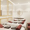 Không chỉ sở hữu những món đồ nội thất sang trọng, thiết kế tầng 1 của thẩm mỹ viện Anna còn vô cùng nổi bật và lạ mắt với chi tiết gương lá hẹ gắn trần và đèn chùm trang trí. Tuy đây chỉ là các khu vực trang trí nhỏ nhưng sẽ giúp thẩm mỹ viện tạo điểm nhấn và gây sự chú ý với khách hàng.