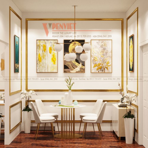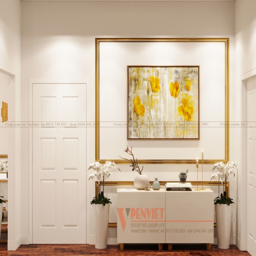 Các đường phào chỉ gắn tường được sơn nhũ vàng bắt mắt tạo điểm nhấn cho toàn bộ căn phòng. Bên cạnh đó, các đường nét này được thiết kế cân xứng tạo thành những mảng tường ấn tượng để chủ đầu tư có thể treo tranh ảnh trang trí phù hợp.