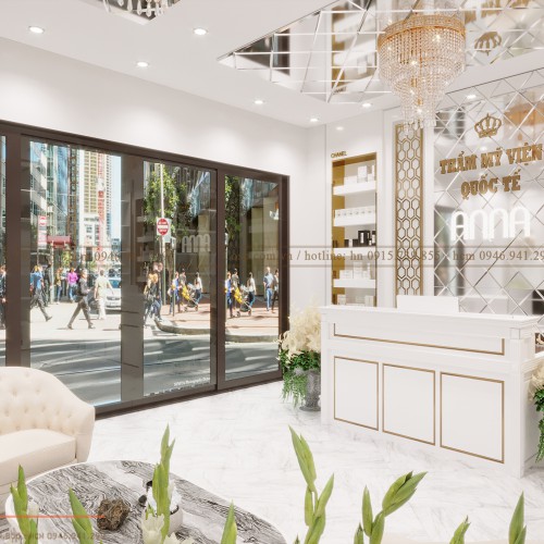 Với những thẩm mỹ viện có quy mô lớn như Anna, không gian tầng 1 được dành trọn làm khu vực lễ tân, tiếp đón khách hàng khi đến với thẩm mỹ viện. Lựa chọn gam màu trắng làm chủ đạo, thiết kế thẩm mỹ viện được thiết kế sang trọng với phong cách tân cổ điển.