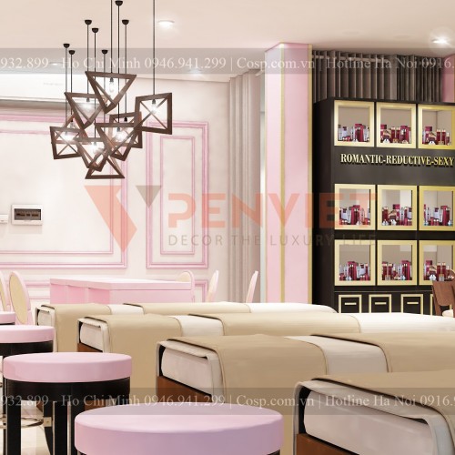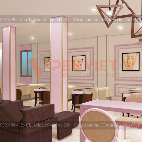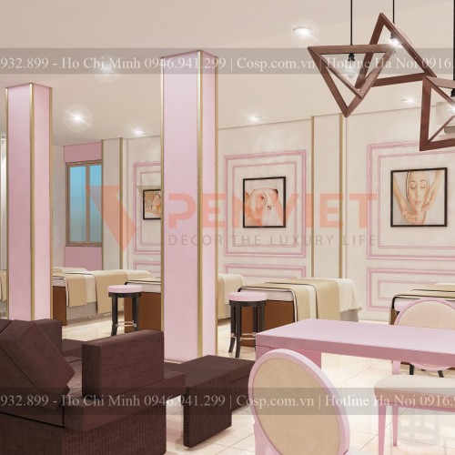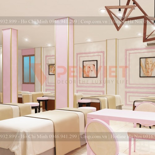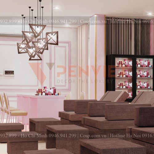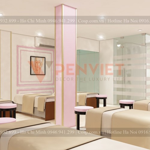 Để tạo nên một không gian kinh doanh ấn tượng, mang sắc thái nhẹ nhàng, đằm thắm nhưng vẫn toát lên sự sang trọng và đẳng cấp, KTS của Penviet đã sử dụng tông màu hồng pastel làm chủ đạo trong mẫu thiết kế spa này. Từng đường phào chỉ và các nẹp kim loại vàng đồng tạo tính thẩm mỹ rất lớn cũng như điểm nhấn nhá cho không gian.