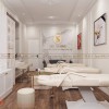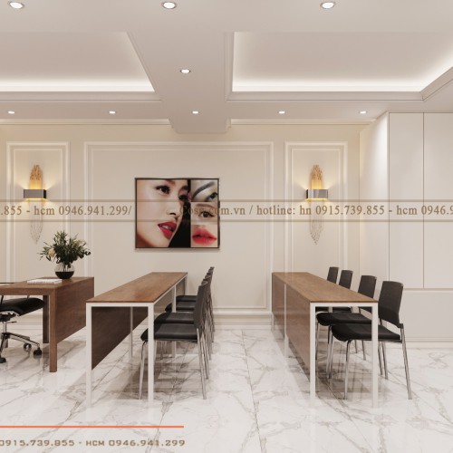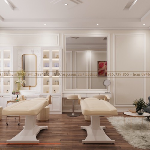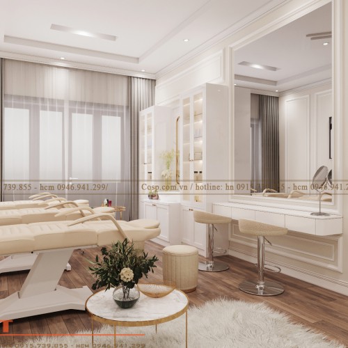 Thiết kế nội thất tiệm phun xăm sử dụng tông màu trắng và vàng đặc trưng của phong cách tân cổ điển. Bên cạnh đó một vài điểm nhấn màu sắc của đồ nội thất, đồ décor tạo nét chấm phá cho không gian. Vật liệu gỗ MDF được mạ vàng inox cao cấp được sử dụng chủ đạo nhằm tăng nét cao cấp tinh tế cho không gian.