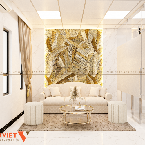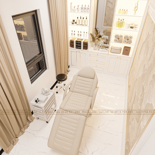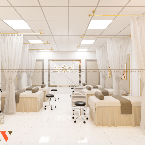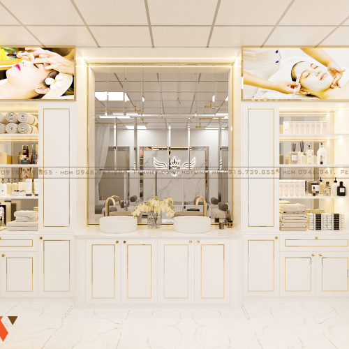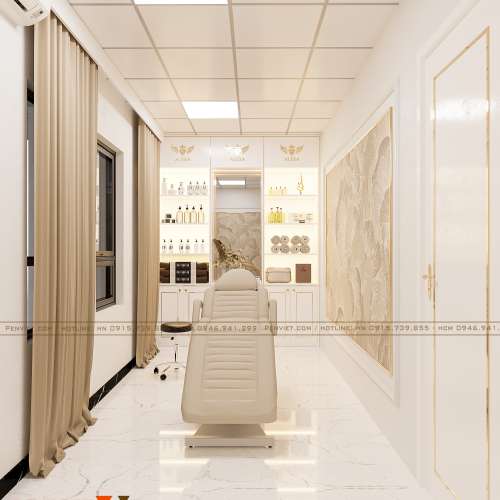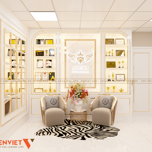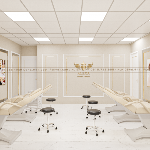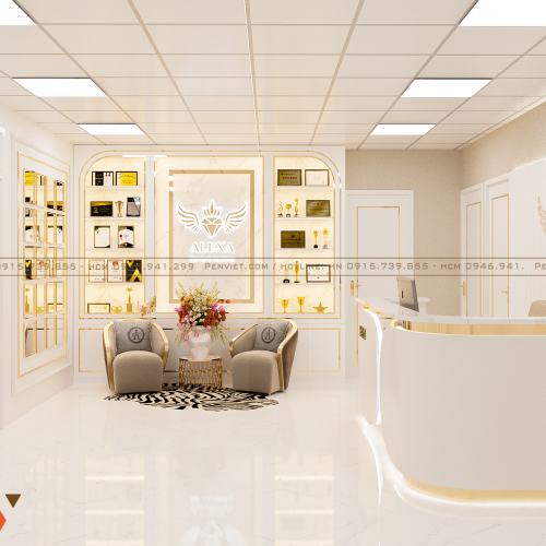 Dự án thiết kế nội thất viện thẩm mỹ quốc tế Alexa sử dụng tone màu sáng làm chủ đạo, kết hợp các chi tiết inox mạ vàng vừa ấm áp nhưng vô cùng sang trọng. Tổng thể không gian spa được phân chia thành nhiều khu vực như phòng hội trường, sảnh đón khách, phòng phun xăm, phòng da, văn phòng.