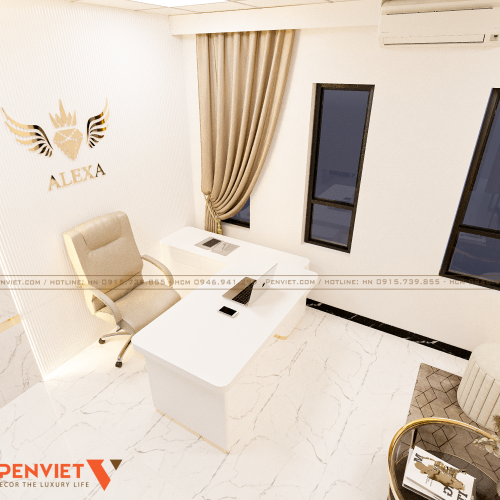 Ngoài ra, còn có bàn làm việc riêng dành cho giám đốc với thiết kế đơn giản nhưng thoải mái. Phía sau bàn làm việc là vách logo thương hiệu quen thuộc đối với viện thẩm mỹ quốc tế Alexa.