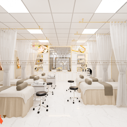 Khu vực làm da được bố trí 5 giường dịch vụ cùng hệ thống máy móc hiện đại, đời mới. Giữa các giường có sử dụng rèm che nhẹ nhàng, tạo cảm giác riêng tư cho khách hàng.