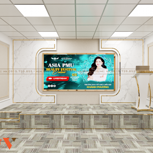 Trong thiết kế viện thẩm mỹ quốc tế Alexa còn có phòng hội trường có sức chứa lên đến hàng trăm khách mời. Khu vực sân khấu của phòng hội trường được setup khá đơn giản nhưng hiện đại, trở nên lộng lẫy hơn dưới ánh đèn chiếu sáng.