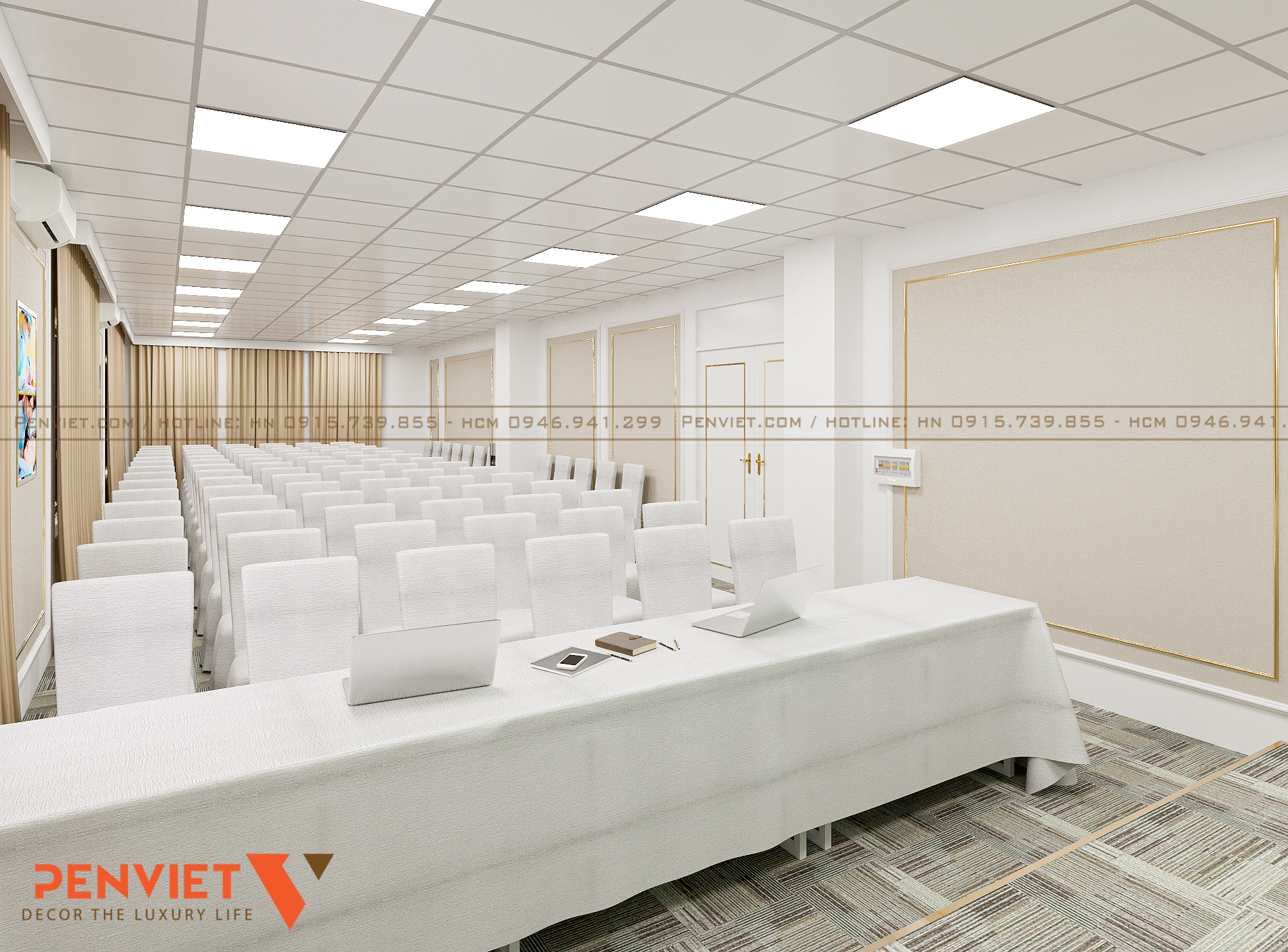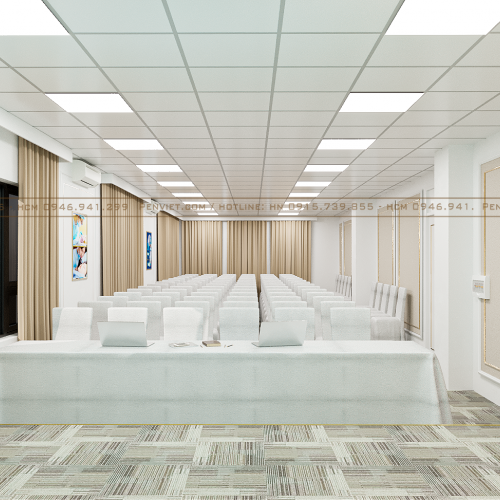 Hệ thống ánh sáng vừa phải, không gian yên tĩnh tạo sự thoải mái cho mọi người khi tham gia. Tổng thể cách bố trí phòng hội trường rất tinh tế và khoa học, thể hiện sự chuyên nghiệp của thương hiệu.