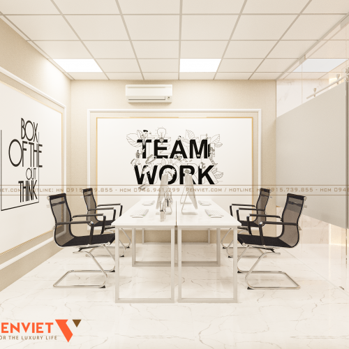 Phòng giám đốc có setup bộ ghế sofa màu trắng sữa hiện đại kết hợp vách trang trí họa tiết ấn tượng phía sau. Đây là nơi để giám đốc tiếp đón nhân viên, khách hàng VIP, đối tác khi có nhu cầu.