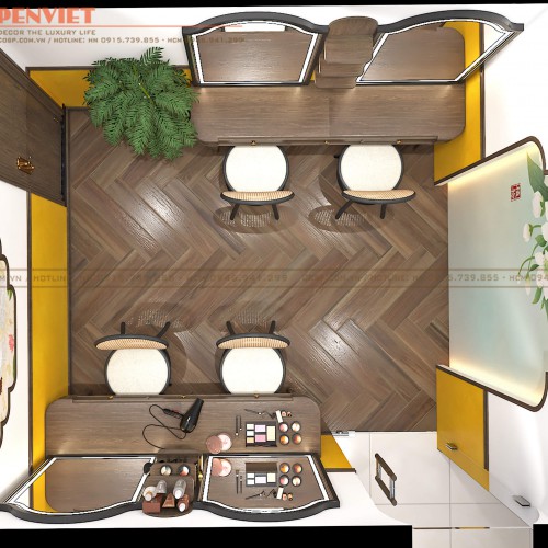 Penviet bố trí các bàn làm tóc, trang điểm bằng gỗ tự nhiên kết hợp gương thủy bi khung gỗ MDF phủ Melamine sát tường và sử dụng thêm các ghế ngồi làm từ gỗ, nhựa giả mây tre đan nhỏ gọn nhằm tối ưu diện tích sử dụng, tạo thành lối đi thông thoáng ở giữa, giúp nhân viên, khách hàng di chuyển thuận tiện.