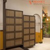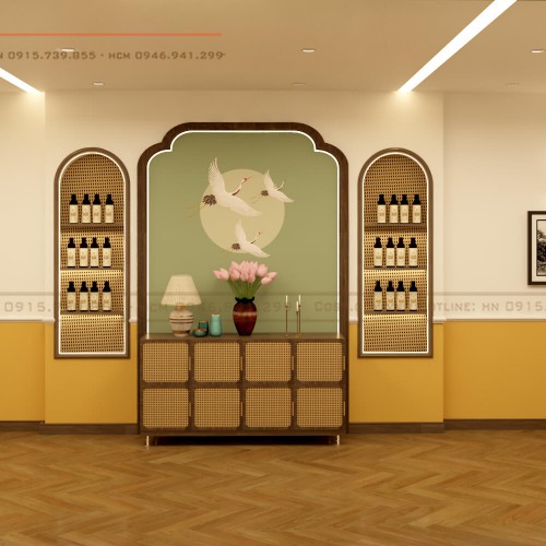 Hệ thống tủ, kệ âm tường bằng gỗ MDF chống ẩm phủ Melamine kết hợp nhựa giả mây tre đan được sử dụng để mở rộng khu vực trưng bày và lưu trữ.