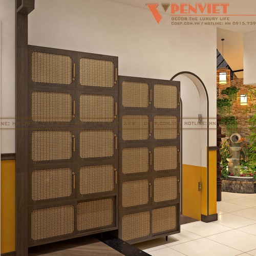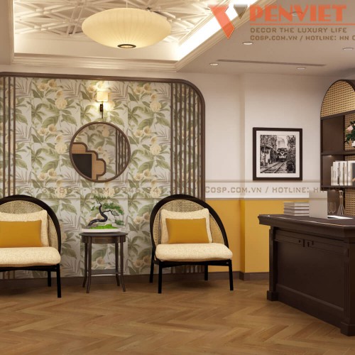 Các mẫu vách trang trí khung gỗ MDF phủ Melamine kết hợp giấy dán tường, gương trang trí khung gỗ MDF phủ Melamine, mảng tranh trang trí treo tivi khung gỗ MDF phủ Melamine cắt CNC cho đến từng bộ bàn ghế đều được Penviet chăm chút, lựa chọn kỹ lưỡng để tạo nên một không gian mang vẻ đẹp Đông Dương đặc trưng.