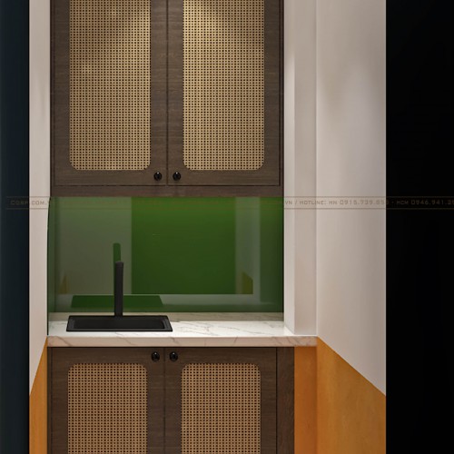 Ngăn tủ ở vị trí thấp được với cánh tủ ốp nhựa giả mây tre đan chẳng những mở rộng khu vực lưu trữ mà còn nhấn mạnh ý tưởng setup cửa tiệm.