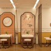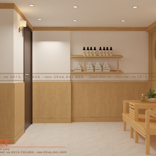 Các chi tiết trang trí như khung CNC ốp trần bằng gỗ MDF sơn 2K hay vách lối đi gỗ MDF phủ melamine…dù được tiết chế những họa tiết xưa nhưng vẫn khiến mẫu thiết kế nội thất spa toát lên được vẻ đẹp truyền thống.