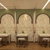 Phòng nail trong thiết kế spa Home được chúng tôi trang trí bởi nhiều khung vòm khung gỗ MDF sơn nhũ vàng, nhựa giả mây tre đan, nền tranh in Canvas được làm nổi bật bởi hệ thống đèn Led viền tạo nên điểm nhấn thu hút.
