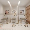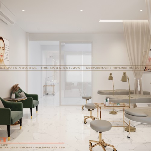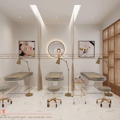 Theo chân chúng tôi, bạn sẽ đến với khu vực phòng chăm sóc da mặt của spa Hoài Thương. Trong mẫu thiết kế nội thất spa Hoài Thương này, PenViet sử dụng chi tiết nẹp inox vàng gold trang trí để tăng thêm phần nổi bật cho không gian.