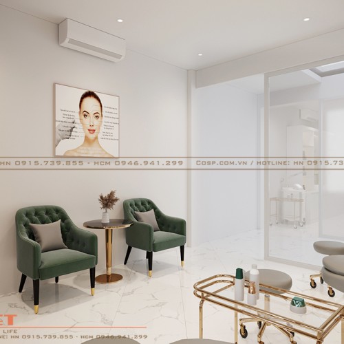 Đối diện quầy lễ tân là bàn ghế dành cho khách hàng ngồi chờ tư vấn trước khi sử dụng dịch vụ làm đẹp. Bộ sofa êm ái có gam màu xanh đồng điệu với màu vách logo vừa đẹp mắt vừa thoải mái khi ngồi.
