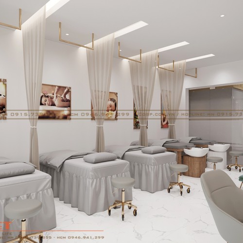 Để tạo sự riêng tư cho khách hàng khi làm đẹp, PenViet sử dụng mẫu rèm che cho từng giường dịch vụ. Đặc biệt hơn, PenViet sử dụng chi tiết viền inox vàng gold cho các đồ nội thất như chân ghế, viền kệ trang trí, viền bục nail… để tạo điểm nhấn sáng giá.