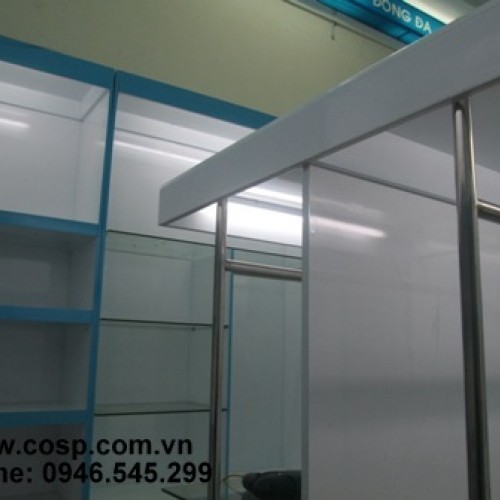với sự kết hợp các nguyên vật liệu hiện đại: gỗ công nghiệp MDF sơn phủ PU cao cấp và sơn bóng kính, các đợt kính, khung kệ và hệ thống móc giá treo bằng inox.