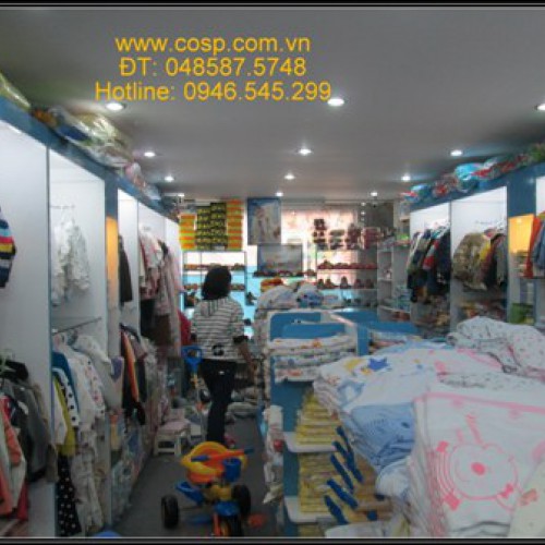 Từ kinh nghiệm thiết kế kids plaza 533 Nguyễn Trãi và dựa trên mong muốn của khách hàng, đội ngũ thiết kế của cosp thiết kế cửa hàng với hệ thống tủ kệ nhiều ngăn tầng nhằm tạo không gian trưng bày sản phẩm.