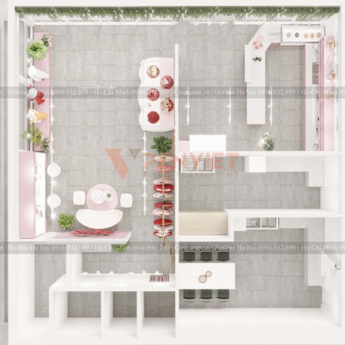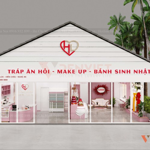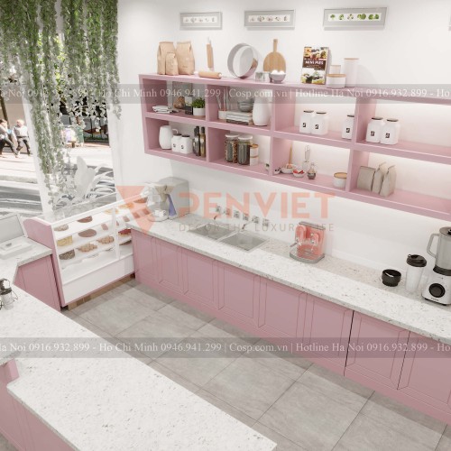 Do đặc thù của cửa hàng là kinh doanh tiệm bánh và dịch vụ ăn hỏi, bởi vậy, ý tưởng của chúng tôi là kết hợp gam màu trắng – hồng để mang đến cảm nhận về sự ngọt ngào, hạnh phúc. Đồng thời, sự kết hợp giữa 2 gam màu này cũng góp phần thể hiện phong cách hiện đại mà Penviet định hình cho cửa tiệm.