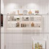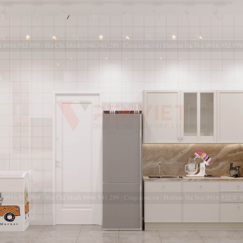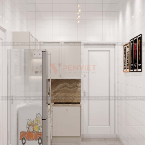 Để tiết kiệm không gian và phù hợp hợp với đặc điểm sử dụng, Penviet thiết kế các tủ sát tường bằng gỗ MDF chống ẩm phủ Acrylic kết hợp với đèn led trong các đợt tủ để đảm bảo ánh sáng.