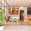 Ngăn cách giữa khu vực bán bánh và cafe là chiếc kệ trang trí với những chậu cây xanh tươi mới. Những bộ bàn ghế gỗ đơn giản được bố trí từng góc để khách hàng có khu vực ngồi thưởng thức những chiếc bánh thơm phức cùng tách cafe đậm vị.