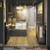 Để tối ưu hóa diện tích, KTS chọn nét thiết kế thông minh như tích hợp quầy thu ngân với tủ trưng bày, thiết kế giá gắn tường giúp thiết kế nội thất tiệm bánh trở nên phong phú hơn. Điểm nhấn có lẽ phải kể đến vách khung ngăn cách được làm từ gỗ thông ghép thanh đảm bảo về chất lượng và thẩm mỹ.