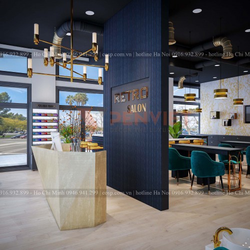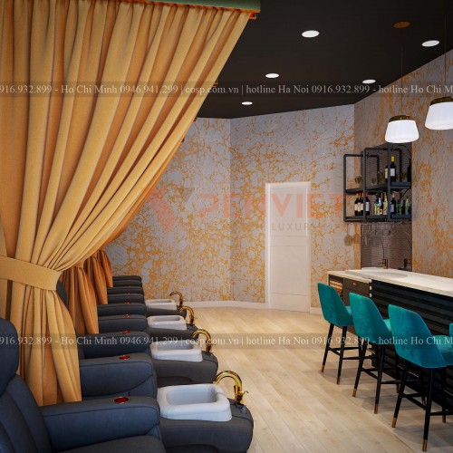 Thiết kế tiệm nail chúng tôi phân chia 3 khu vực: khu vực quầy thu ngân, khu vực làm nail và phòng spa nhỏ. Phối hợp màu sắc tiệm nail với tông màu trung tính chủ đạo tạo nền sang trọng, tông màu xanh, màu đồng tạo điểm nhấn thu hút.