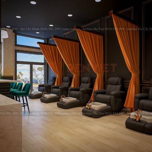 Khu vực làm nail chân sử dụng hệ ghế nail mềm mại giúp khách hàng được thoải mái khi làm nail. Giữa mỗi ghế nail sử dụng một tấm rèm sang chảnh tạo nên sự riêng cho tư khách hàng.