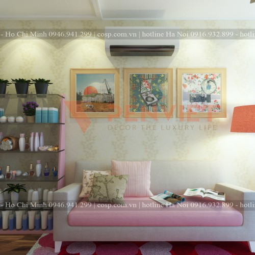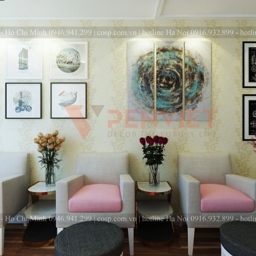 Cửa hàng nail của Chị Thúy được sử dụng những chiếc ghế sofa ngồi ấn tượng màu trắng sữa, hồng nhẹ nhàng vừa tạo sự gần gữi, êm ái đem đến cảm giác thoải mái cho khách hàng. Chiếc thảm hình trái tim hay những bức tranh treo tường độc đáo đã để lại chút nhấn nhá và làm nên một thiết kế tiệm nail nhỏ đẹp cho chị Thúy.