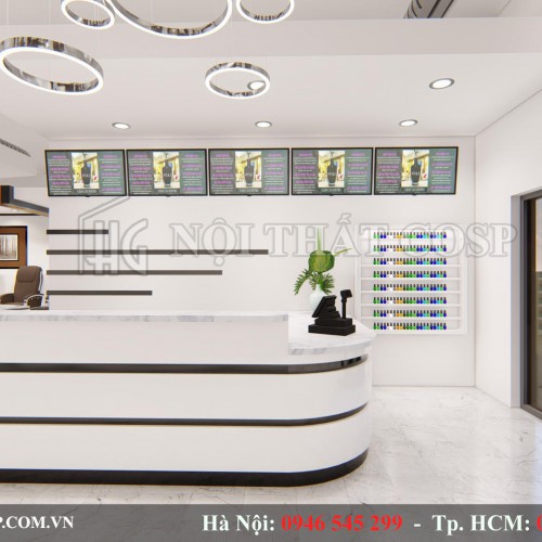 Ngay tại lối ra vào, chúng tôi đặt quầy thu ngân được làm từ chất liệu gỗ MDF cao cấp với thiết kế dày dặn và chắc chắn, đường kẻ đen làm nổi bật hình khối và đường nét của nội thất, tạo nên một thiết kế tiệm nail đẹp.