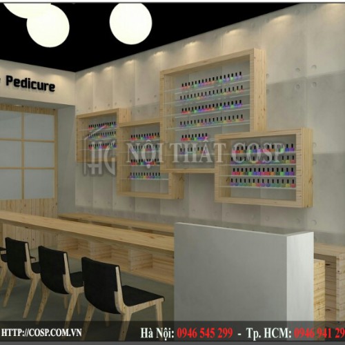 Bên cạnh đó, chúng tôi sử dụng thêm hệ kệ trưng bày treo tường được sắp xếp rất thú vị vừa tận dụng không gian để trưng bày sản phẩm làm nail vừa tạo nên sự bắt mắt. Phần khung gỗ với màu vàng nhạt cũng đem lại sự tinh tế cho không gian chung. Ngoài ra, những chiếc ghế ngồi cùng một số mảng tường được sơn đen để cân đối lại màu sắc trong không gian ở đây.