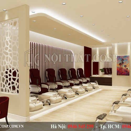 Chị Hoa tìm đến Nội thất COSP với mong muốn có cho mình một không gian nội thất tiệm nails & spa Q hiện đại, đẳng cấp và tinh tế. Chúng tôi đã tận dụng kinh nghiệm lâu năm cùng đội ngũ thiết kế giàu sáng tạo, yêu nghề dể mang tới mẫu thiết kế tiệm nails & spa Q cực kì thu hút.