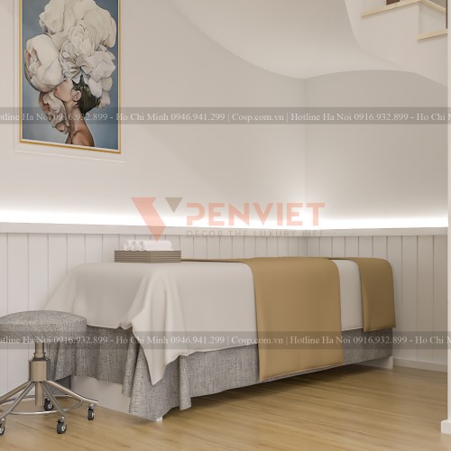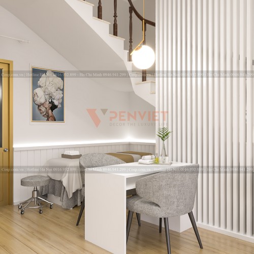 Vì diện tích của tiệm spa nail phun xăm này khá khiêm tốn, chỉ có 40m2 nên KTS của Penviet những tone màu sáng để thiết kế spa mini. Mục đích là để tạo ra không gian sáng, tạo cảm giác thông thoáng, rộng rãi cho người nhìn. Ngoài gam màu trắng được đưa vào thiết kế thì màu vàng óng ánh của những viền nẹp tạo nên một không gian kinh doanh lung linh, hiện đại và sang trọng.
