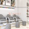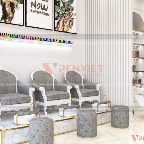 Khu vực làm nails thì được thiết kế với những chiếc ghế ngồi sofa bằng khung gỗ cùng nệm Hàn bọc nỉ được đặt trên chiếc bục gỗ thông ghép thanh sơn PU. Từng bộ chậu rửa, vòi nước và gác chân bằng khung gỗ tự nhiên cũng được lắp đặt trên bục kê để phục vụ cho hoạt động làm móng chân được dễ dàng. Những chiếc ghế đôn đệm bọc nỉ với khung gỗ tự nhiên cũng được đặt ngay cạnh làm chỗ ngồi cho nhân viên phục vụ.