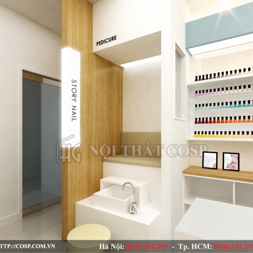 Với diện tích vừa phải, bố cục nội thất tiệm nail được thiết kế và bài trí một cách tối ưu nhất mang đến sự tiện nghi. thoải mái nhưng vẫn đảm bảo tính thẩm mỹ cho tiệm. Các kệ tủ đựng đồ được áp sát vào tường, các kệ trưng bày được cố định chắc chắn trưng bày các mẫu sơn, màu sơn nail.