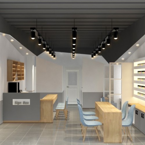 Thiết kế tiệm nail chúng tôi sử dụng màu sơn trắng cho mặt tường ở đây với mục đích gợi mở không gian và tạo được sự thoải mái. Ngược lại, mặt trần lại được chúng tôi sơn màu xám ghi đậm để đem đến chiều sâu cho không gian chung. Đồng thời, sự sang trọng cũng nhờ đó mà được tô điểm thêm.