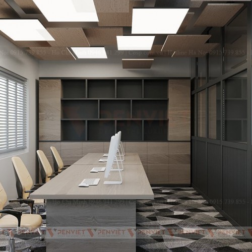 Bên cạnh việc cải tạo lại các vách kính, làm tường thạch cao, Nội thất Penviet tiến hành lát lại sàn bằng gạch tối màu, giúp cho văn phòng luôn giữ được sự sạch sẽ. Ngoài ra, chúng tôi cũng thi công trần thạch cao kết hợp với trang trí trần gỗ sáng tạo, sử dụng đèn chiếu sáng độc đáo, tạo nên tính thẩm mỹ và nghệ thuật cho thiết kế văn phòng.