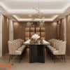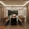 Ánh sáng được xử lý theo nhiều lớp, kết hợp giữa đèn âm trần, đèn hắt và đèn trang trí trung tâm. Hệ đèn thả với thiết kế tinh tế giúp không gian tiếp khách trở nên nổi bật hơn mà không gây rối mắt. Cách bố trí ánh sáng này giúp nâng cao trải nghiệm sử dụng, đồng thời làm nổi bật các chi tiết nội thất quan trọng.