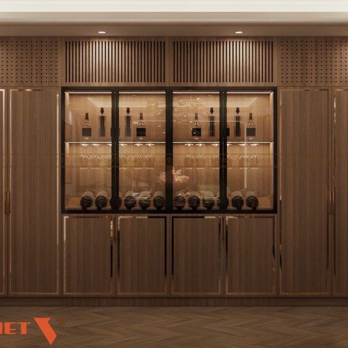 Phía cuối không gian là hệ tủ trưng bày được thiết kế âm tường, vừa tiết kiệm diện tích vừa tăng giá trị thẩm mỹ. Các ô tủ có đèn hắt nhẹ giúp làm nổi bật vật phẩm trưng bày, đồng thời tạo chiều sâu cho không gian tiếp khách. Đây là giải pháp rất đáng cân nhắc khi cải tạo những không gian cần sự sang trọng và riêng tư.