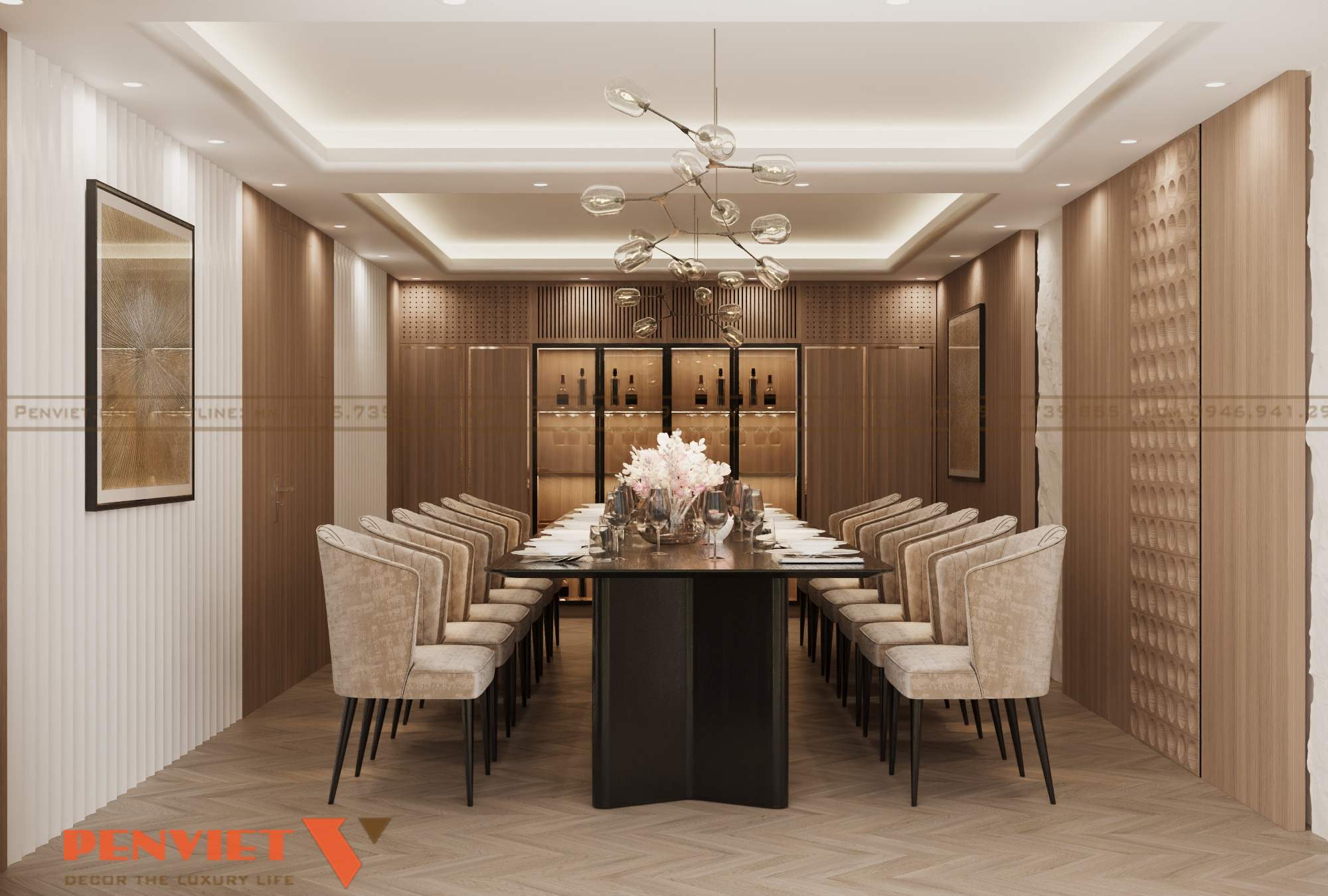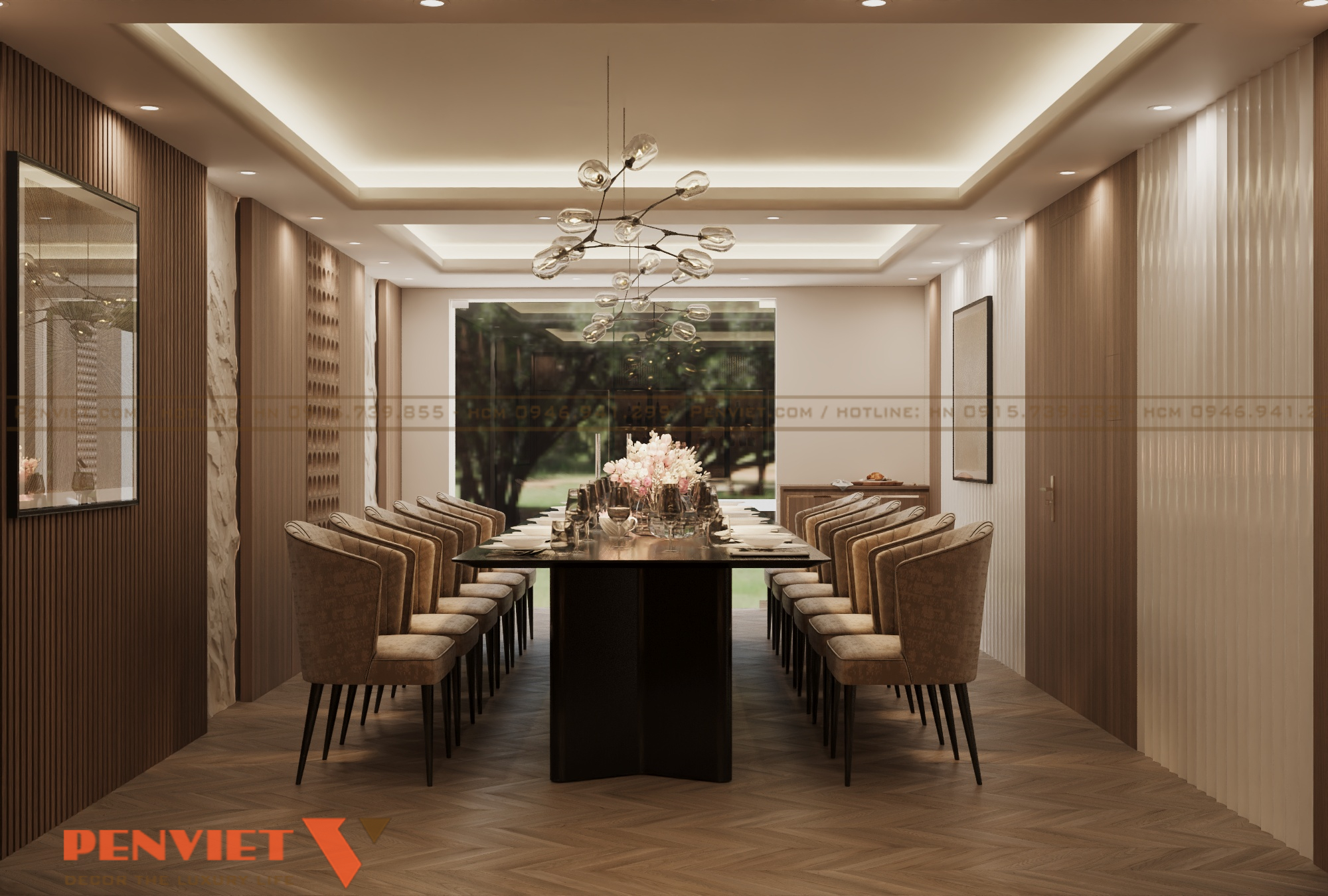 Điểm nổi bật dễ nhận thấy trong không gian là khu vực bàn tiếp khách được đặt ở vị trí trung tâm. Bàn dài kết hợp ghế bọc nỉ sáng màu giúp tăng cảm giác ấm cúng nhưng vẫn giữ được sự trang trọng. Bố cục này rất phù hợp cho các buổi tiếp khách đông người hoặc những cuộc trò chuyện cần sự nghiêm túc.